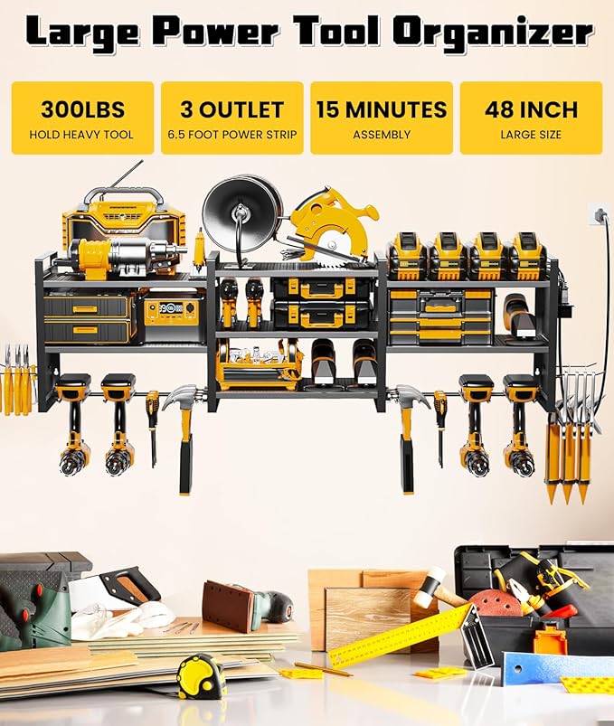 - 【3 IN 1 POWER TOOL ORGANIZER】Our 3-tier extra-long garage organization with charging station measures 48.78 inches deep x 9 feet wide x 14.5 feet high, with a wider center section to provide ample storage space for your tools. In addition to the center tier, the shelves on both sides are set at different heights for tools of various shapes to meet your individual needs.