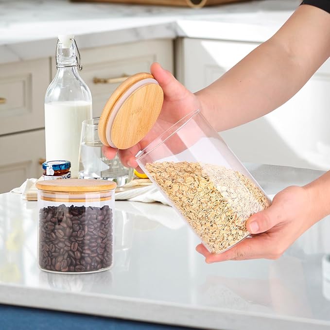 - Airtight Seal Natural Bamboo Lids: Each glass jar with an airtight silicone-sealed lid, ensuring your food stays fresh for longer. Whether you're storing dry goods like flour, sugar, pasta, or snacks, these glass food storage containers with lids keep moisture and air out, preserving your food's quality.