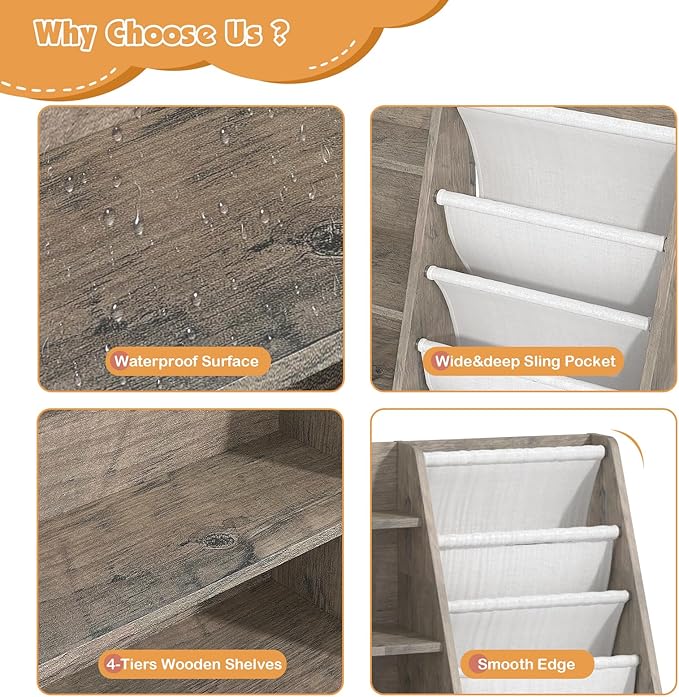 - Multifunctional Nursery Bookcase: You will love the simplicity and ample storage design. This 4 tier sling bookshelf design is ideal for different kinds of scenarios such as nursery, kids’ room, kindergarten, playroom, classroom, bedroom, living room, entrance, etc.