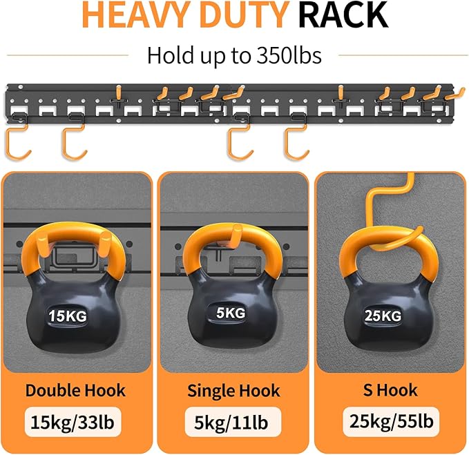 - Heavy Duty & Rubber-Coated Hooks: The garden tool organizer rack made of premium quality alloy steel, which is study, rust-resistant and not easy deform, can ensure a long-lasting performance and hold up to 350lbs. Each hook coated with rubber, which is non-slip and protect your tools from scratches