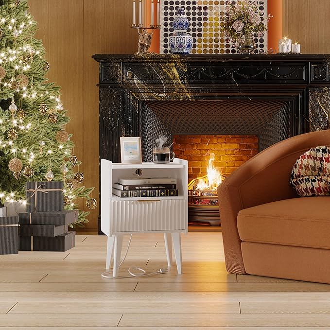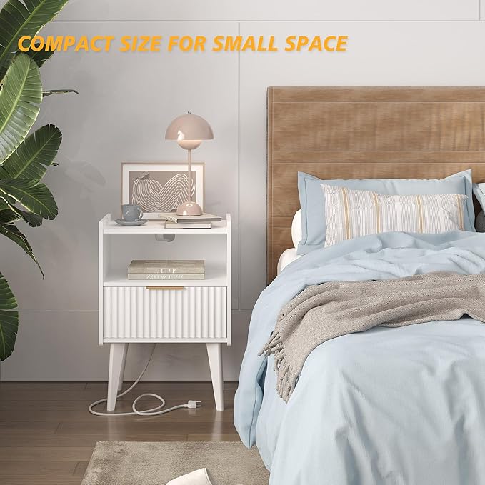Fluted Nightstand with Charging Station, Modern Bedside Table with Drawer,White Nightstand with Solid Wood Legs, End Table,Side Table for Living Room,Bedroom White CTG57WE