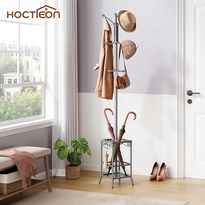 Hoctieon Coat Rack Freestanding With Umbrella Holder, Metal Coat Tree With 12 Hooks, Standing Hanger for Entryway, Hat Rack for Home Office, Gray