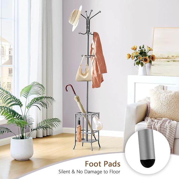 - Functional Umbrella Holder: Featuring an umbrella stand, this coat tree can hold both long-handle and folding umbrellas. The bottom tray is designed to protect your floors from rain water damage, providing a reliable storage solution for wet umbrellas