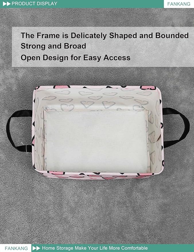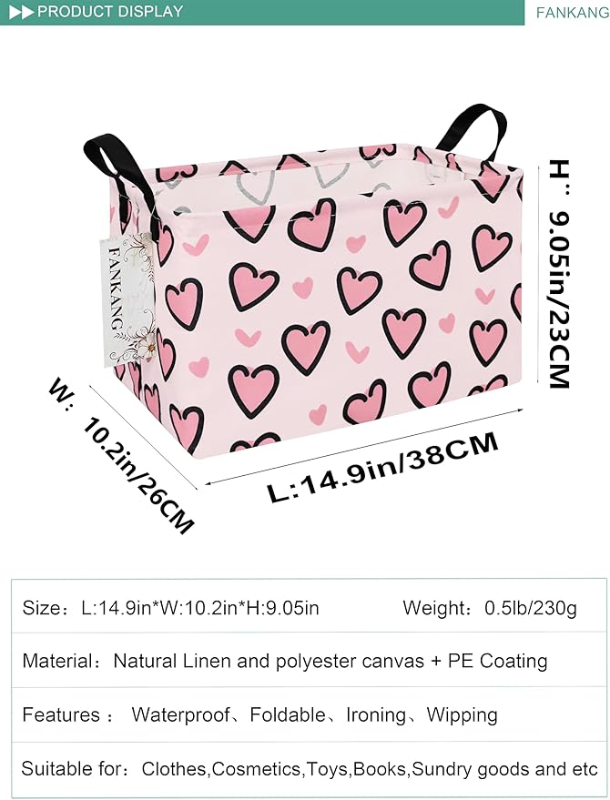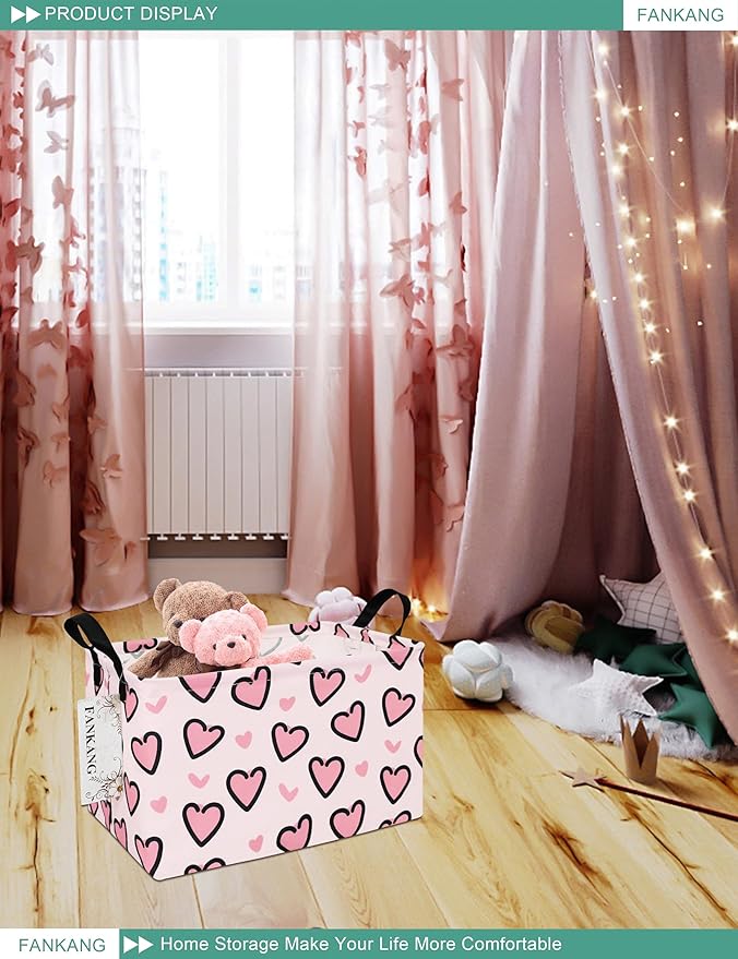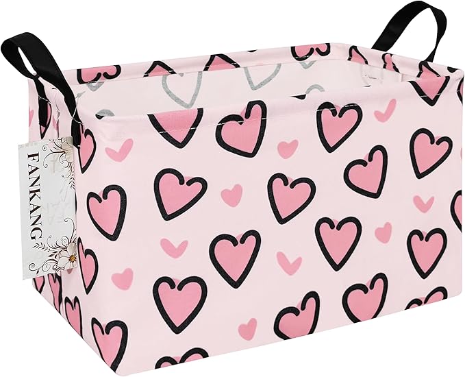 FANKANG Storage Bins, Nursery Hamper Canvas Laundry Basket Foldable with Waterproof PE Coating Large Storage Baskets for Kids Boys and Girls, Office, Bedroom, Clothes,Toys(Rec-Pink Love )