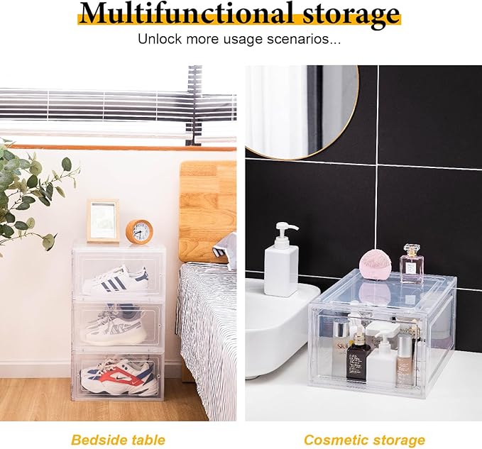 - Sturdy and Stackable:Our clear shoe box is made of heavy-duty plastic sides, Its thick design makes it reliable and durable. The sneaker storage has a simple interlocking design, and each stackable shoe bins storage can be connected together for easy carrying
