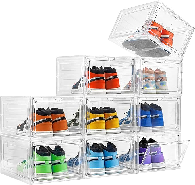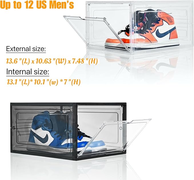 - Clear magnetic door: The clear drop front opening design makes it easy to see all your shoes, air holes allow shoes to breathe; Upgraded the magnetic door of the sneakers box, using double magnetic suction to make the transparent acrylic door close more tightly