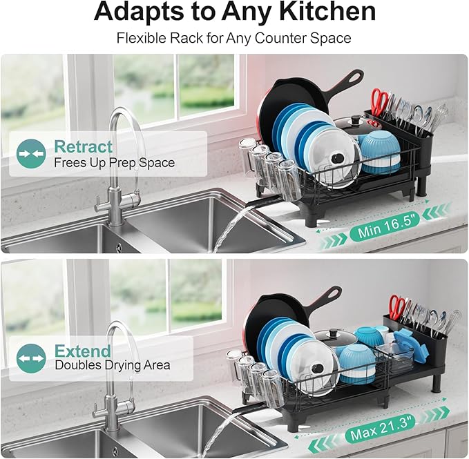 - Expandable Design Fits Any Counter: Adjustable metal dish drying rack expands from 18.9” to 26.2” in length, ideal for intimate dinners or large gatherings. Optimize your countertop space effortlessly. Check the size before purchase to make sure it fits your countertop.