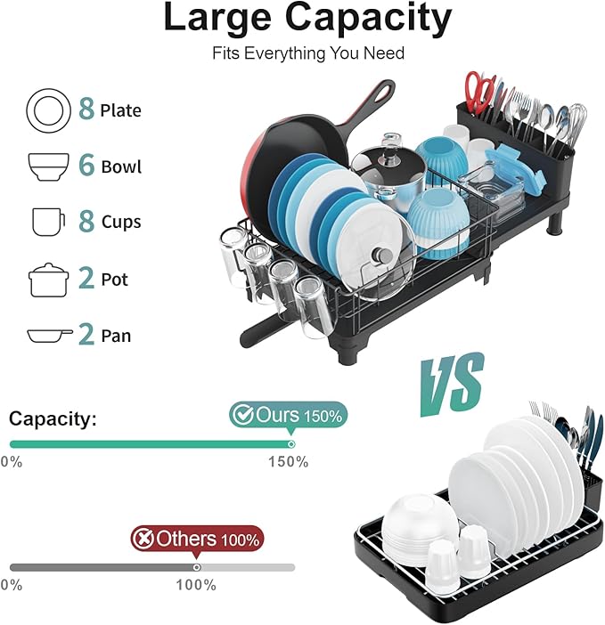 - Anti-Slip & Safe for Countertop Use: Equipped with anti-slip silicone caps to secure the rack firmly on your countertop. Heightened side rails ensure dishes stay safe and stable during drying.
