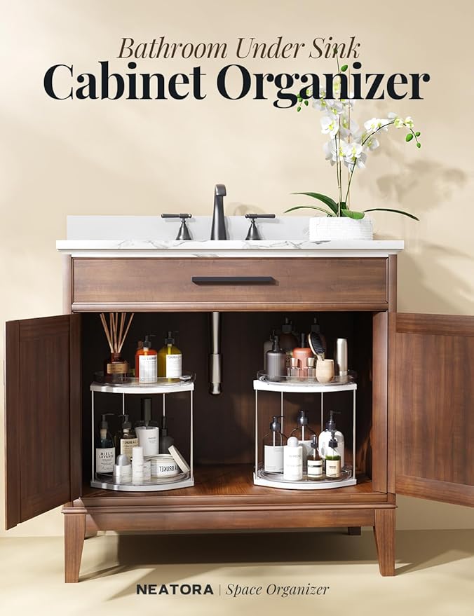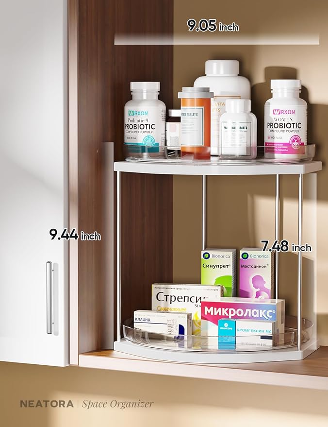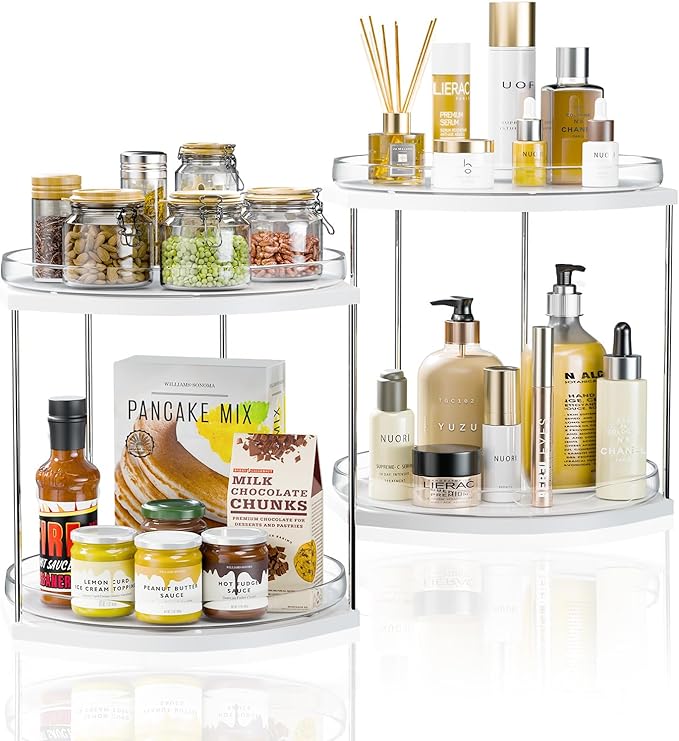 - 2-Tier Space Saver for Vertical Storage: The double-layer design transforms unused vertical space into efficient storage. This Lazy Susan turntable fits snugly into corner cabinets or countertops, maximizing storage in tight spaces. Perfect for kitchen, pantry, bathroom, or vanity areas.