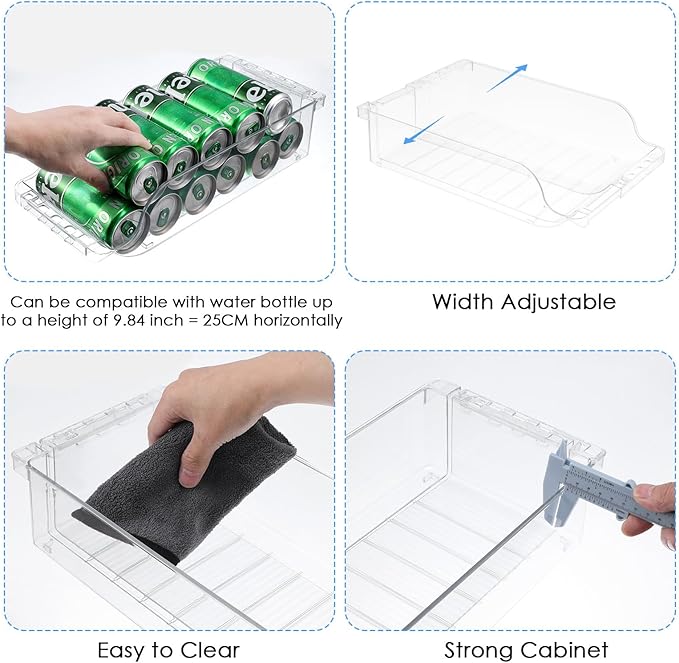 - 【New Adjustable Design】The width of the can organizer can be adjusted between (6.88 inches = 17.48cm) and (10.24 inches = 26cm) according to our needs, making it suitable for most cabinets, pantries, refrigerators, and fridge providing more options for your living space.