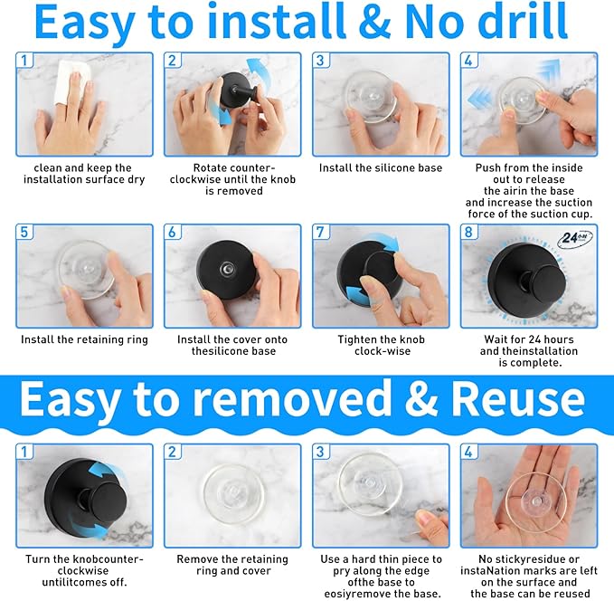 - 【Simple and Tool - Free Installation】Installation is tool - free and screw - free, sparing you the trouble of making holes on the wall. Here are the easy steps: 1, Choose and Clean any smooth and non-porous surface. 2, Fully loosen the hook counter-clockwise. 3, Press the base against your surface, and twist the hook clockwise until fully tight. Watch our video for detailed instructions