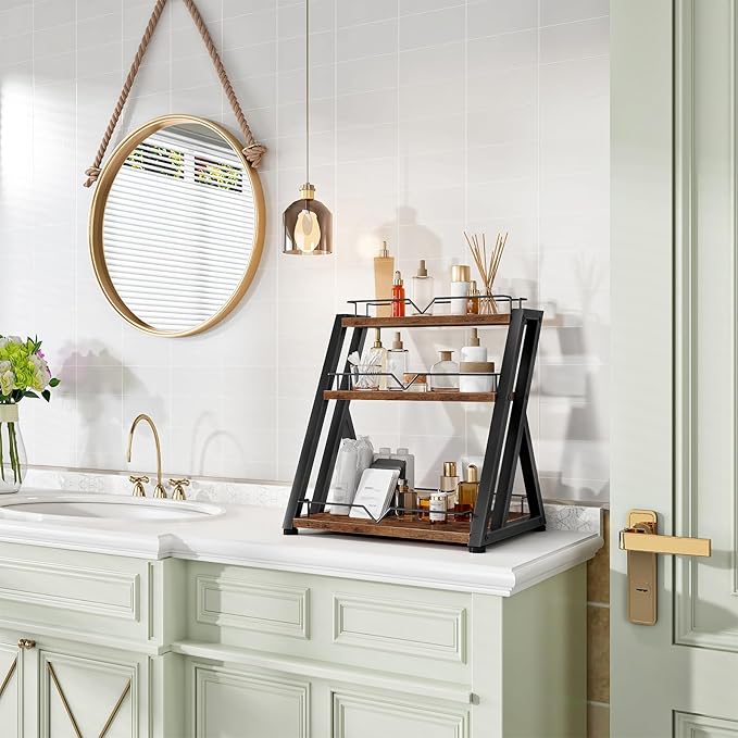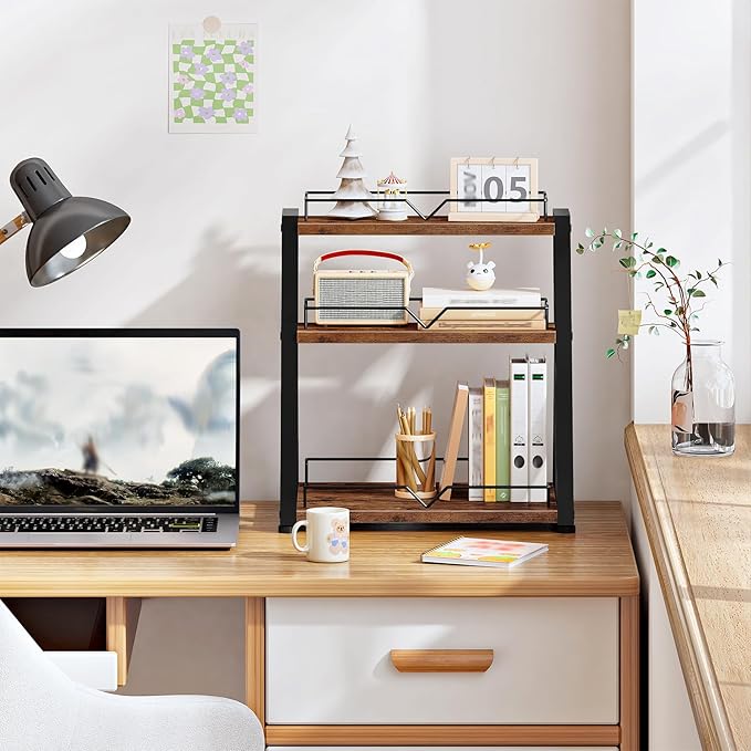 HOOBRO 3-Tier Kitchen Spice Rack, Kitchen Countertop Shelf, Desk Shelf Organizer, Dresser Top Storage Rack, for Office, Living Room, Bathroom, Rustic Brown and Black BF10TL01