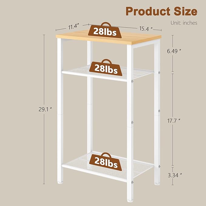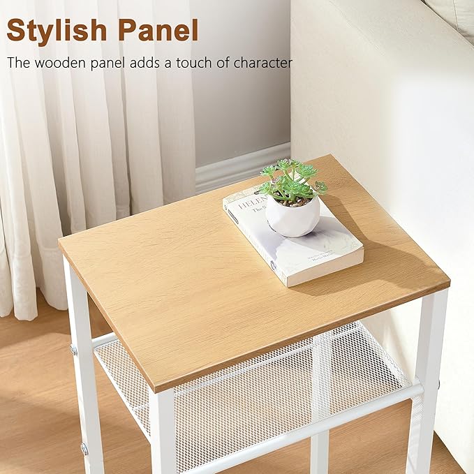 Hoctieon 3 Tier End Table, Telephone Table, Narrow Side Table with Storage, Nightstand for Small Spaces, Metal Frame, for Living Room, Bedroom, Sofa Couch, Hall, Easy Assembly, White and Yellow Oak