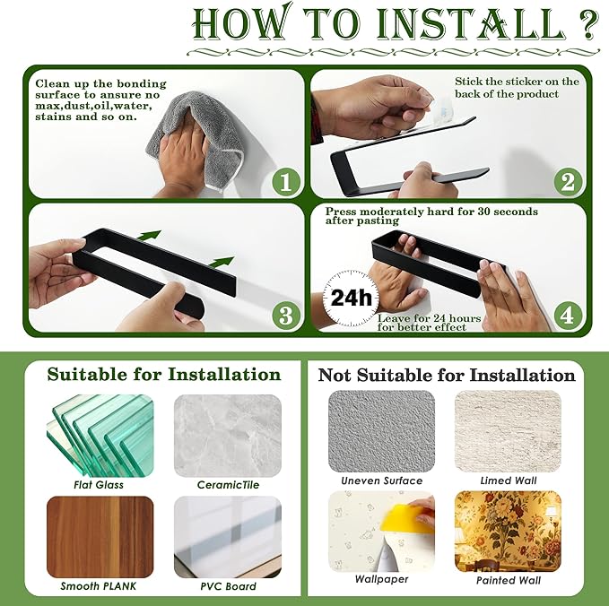 - 【Matte Black Finished】The self adhesive towel ring is finished by ultra high temperature matte black spraying technology, black surface is smooth and beautiful, not easy to oxidation, fading and paint off