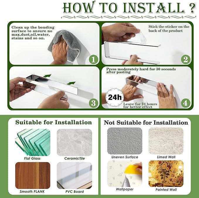- 【Easy To Install】No drilling required. The bathroom towel rack use of strong self adhesive sticker on wall, enough viscosity is not easy to fall, convenient and practical, and without damage the walls.