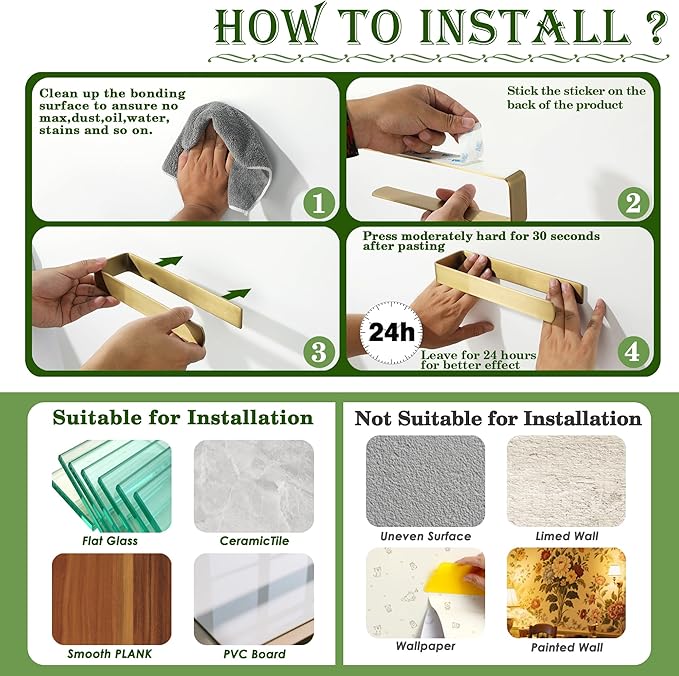 - 【Nice Gold Finish】The self adhesive towel ring is finished by dazzling and gorgeous gold and sealing glaze, beautiful color, not easy to oxidize and fade, the shiny look makes this bathroom towel bar a focal point everywhere, and is also perfect for a variety of bathroom finishing styles.