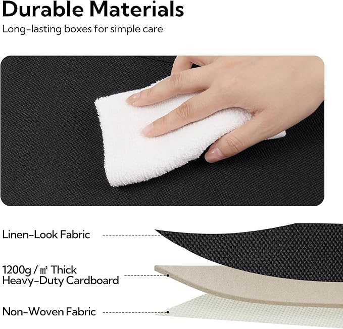 - Eco-Friendly Material - Made of textured linen-like fabric, breathable and wear-resistant, without irritating odor. Fabric boxes come in sets of 3, each measuring 15½"L x 11¾"W x 10¼"H.