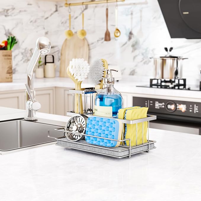 - [Anti-slip Kitchen Caddy]: We know many customers will worry about instability of kitchen sponge holder. Therefore, our kitchen sink accessories added non-slip rubber feet. No need to worry about sliding and stability of this sponge caddy