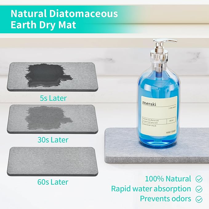 - [Instant Dry Sink Caddy]: The bottom of our sponge holder is made of diatomaceous earth absorbent mat, which automatically absorbs water and dries in 60 seconds, no longer need to manually pour water.The mat is removable, so you can remove it for cleaning