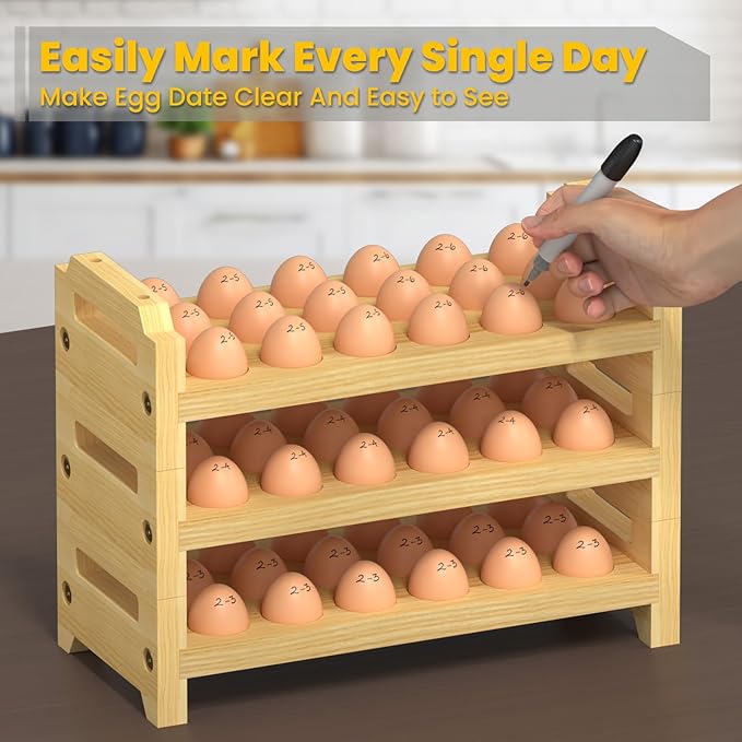 - 【Thoughtful Design】--The stackable design of the wood egg holder not only saves space but also allows you to sort eggs by freshness date. You can easily reach and take eggs from both the top and bottom layers.