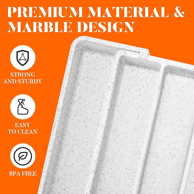Expandable Large Silverware Organizer, Utensil Drawer Organizer for Kitchen Cutlery, Marble Design, Adjustable Cooking Utensil Tray, Plastic Spatula Tools and Gadgets Storage Divider, White
