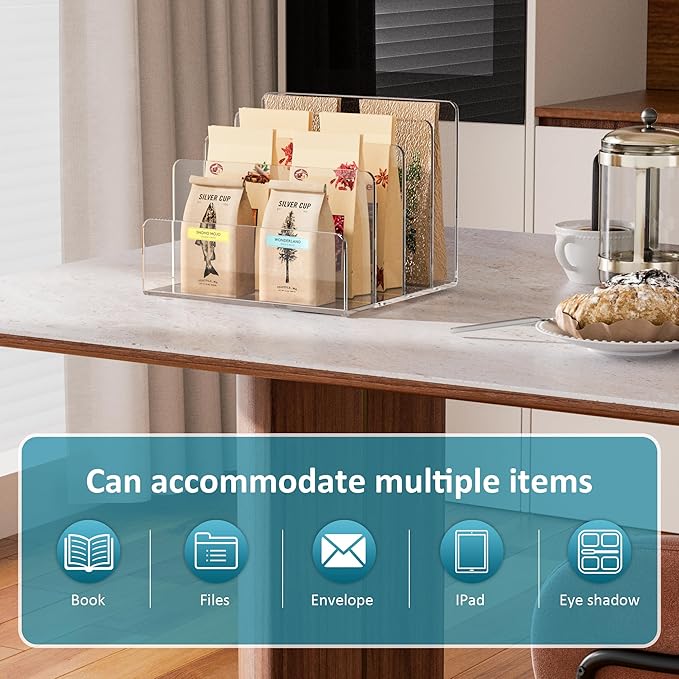 - Wide Application: The acrylic holder can be used for so many items display. It can be used for files, envelope, documents, magazines, phone, letters in your office. Or you can use it for cosmetics,Ipad, vinyls, eye shadows, makeups in your home. Multifunctions for your goods organizer.