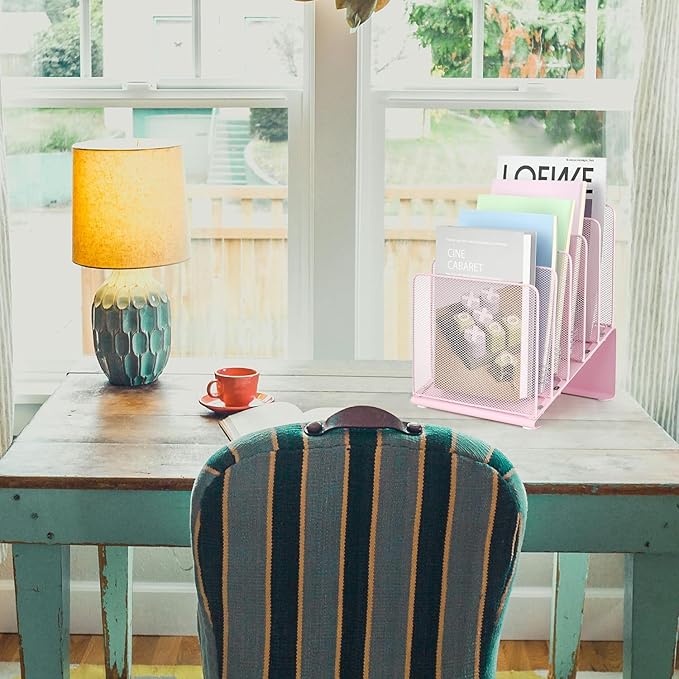 File Organizer for Desk, Desk Organizer with 5-Section Vertical File Rack, File Folder Organizer, Desk Accessories & Workspace Organizers (Pink)