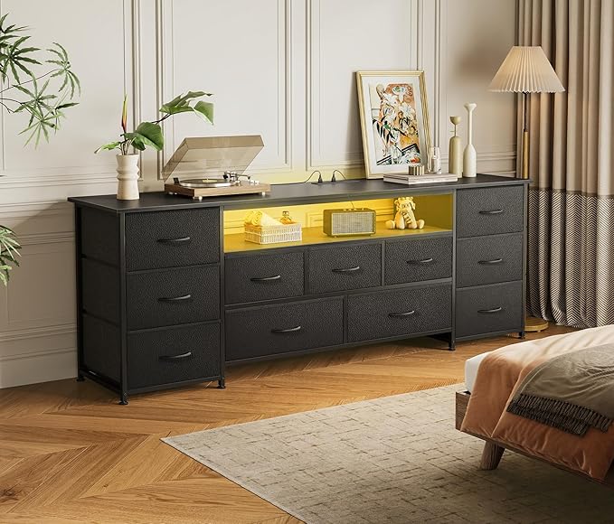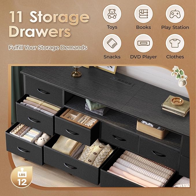 - 【11 Drawer Dresser with Stunning Storage】Featuring 11 drawers in 3 sizes, this TV stand with drawers has a stunning storage, allowing you to neatly organize and store your media devices, DVDs, gaming consoles, books, other accessories. The drawers are great for additional, out of sight storage. You can also use it to accommadte various clothing