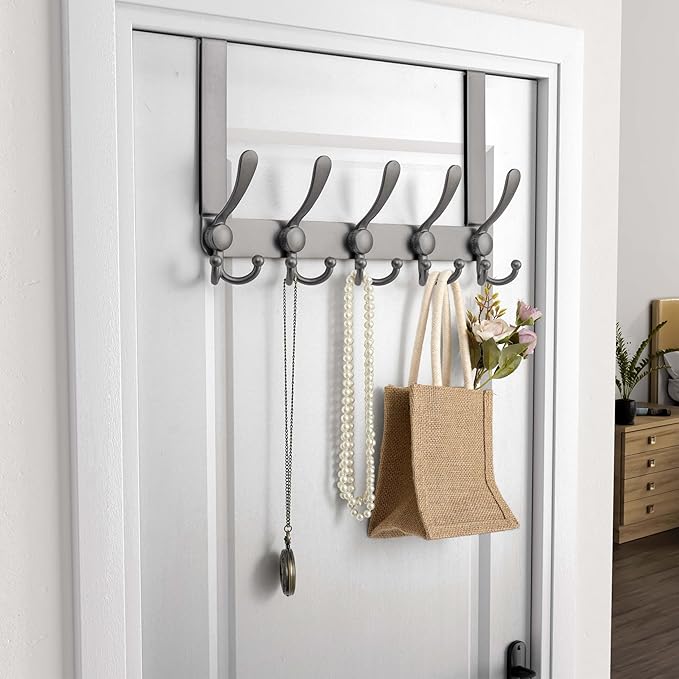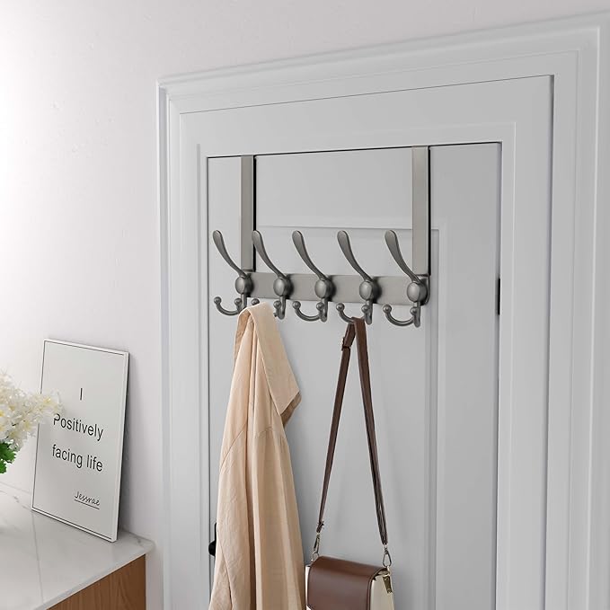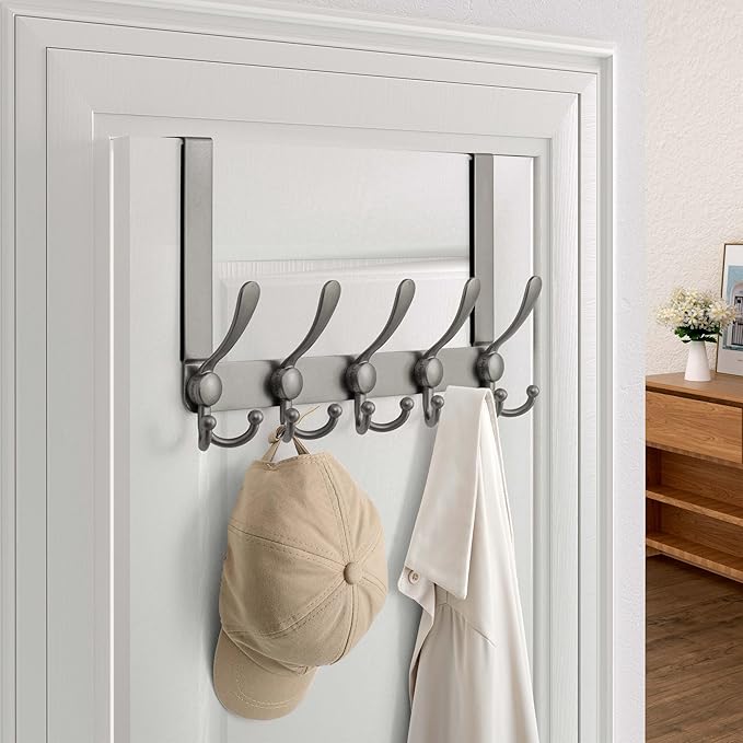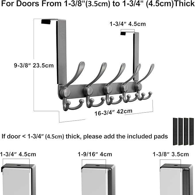 - 【ULTRA PRATICAL:】 Extra utility over door rack with 5 tri hooks well organizes coats, clothes, towels, hats, bags, etc.. Ideal for entryways, bathrooms, mudrooms, and closets. Including 1 x behind door hook, pads, mounting hardware, color: grey