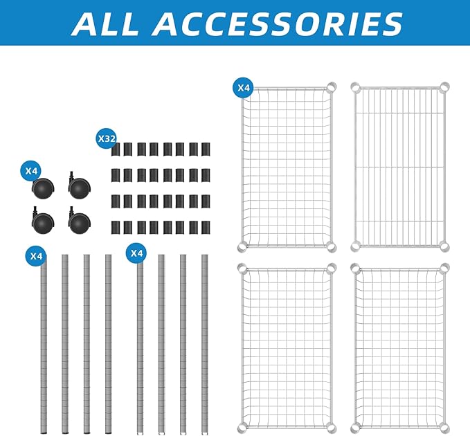 - What You Will Get: Wire Shelving include: 4 pieces of Metal Mesh Board, 4 pcs Upper Pole,4 pcs Bottom Pole, 32 pcs Clips,4 Castors