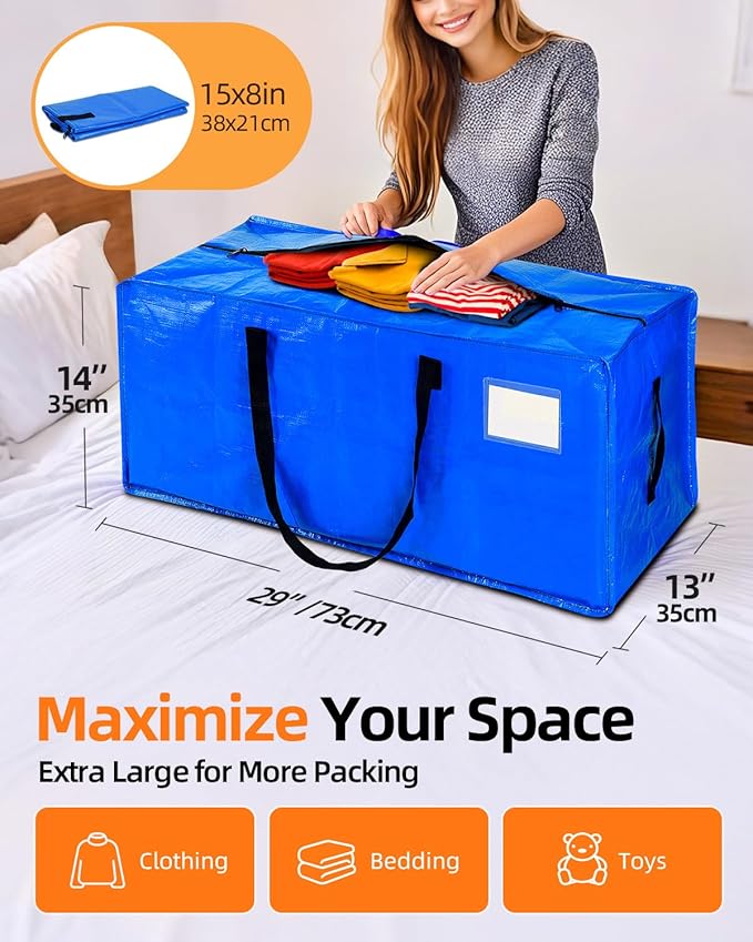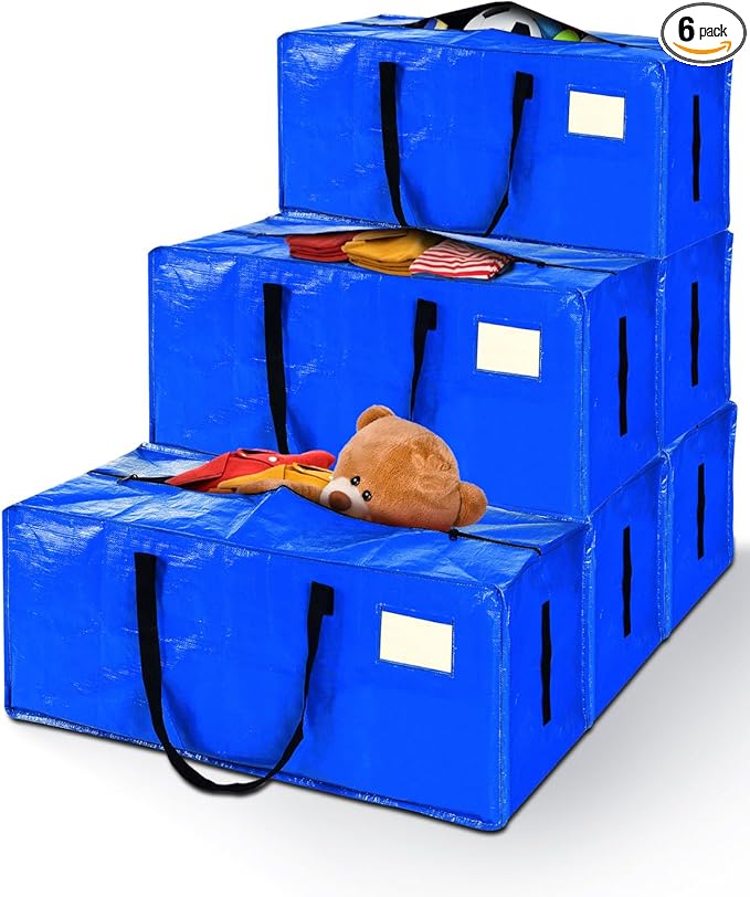 6 Pack Extra Large Moving Bags, Heavy Duty Packing Bags with Zippers and Handles for Space Saving, Clothes Storage, College Essentials, Travel, Blue