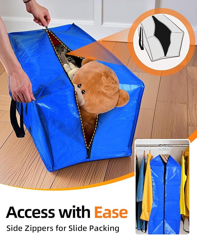 - 【Size-Zip Opening】 This moving bag is designed with side open for easy access. The 2-way durable zippers add lasting durability. The smart side-zip opening allows easy loading/unloading, while also converting into a hanging closet for wrinkle-free garment storage.