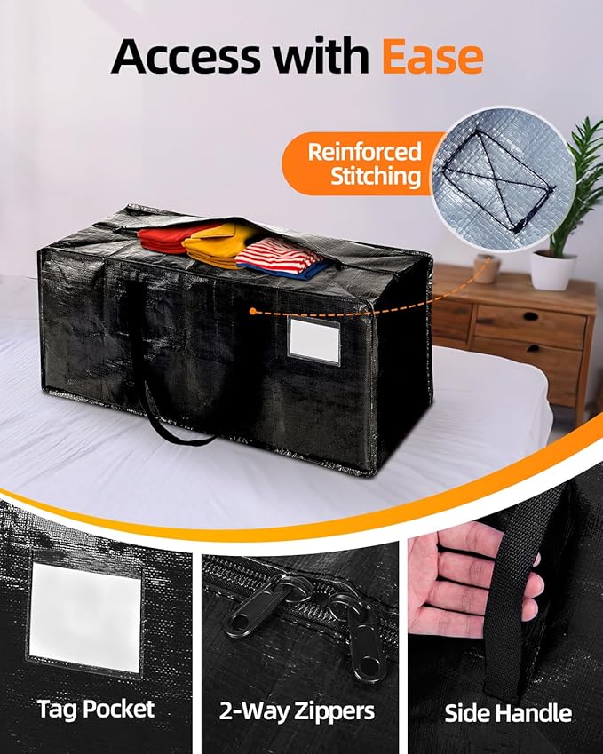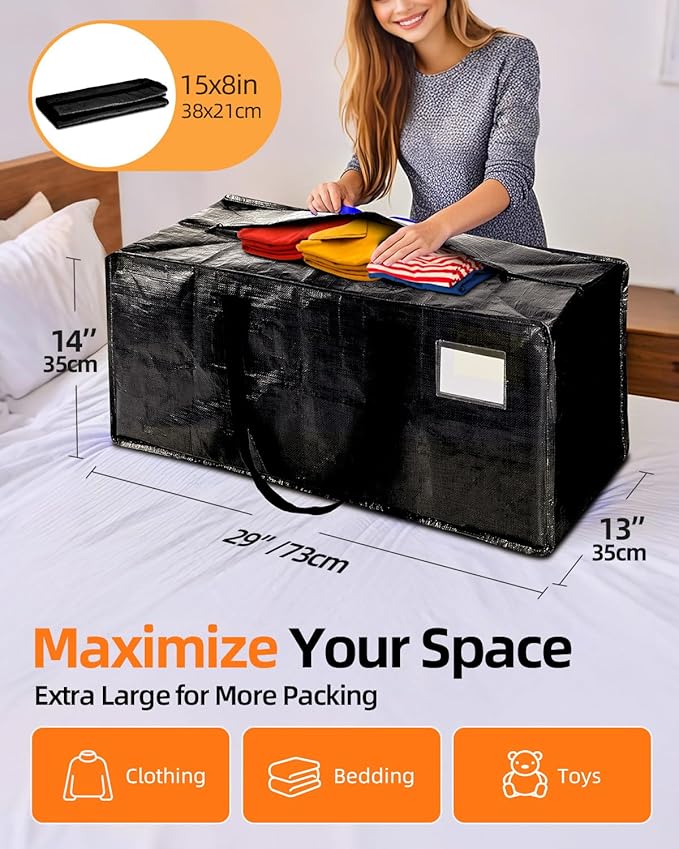 6 Pack Extra Large Moving Bags, Heavy Duty Packing Bags with Zippers and Handles for Space Saving, Clothes Storage, College Essentials, Travel, Black