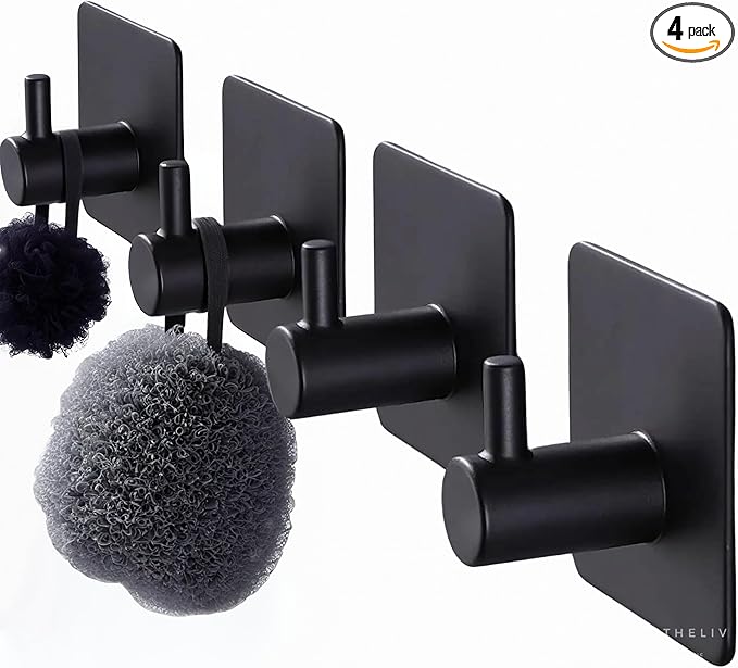 Adhesive Hooks for Hanging - 4 PCs, Towels Hooks for Bathroom, Sticky Hooks for Walls No Damage, Adhesive Hook for Outside, Kitchen, Bathroom, Office (Black 1)