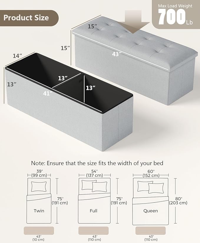 Folding Storage Ottoman Bench, Multi-Functional Ottoman Footrest, End of Bed Bench, Storage Chest for Living Room, Bedroom, Hallway, Entryway, Holds Up to 700 lbs (Light Gray, 43 Inches)