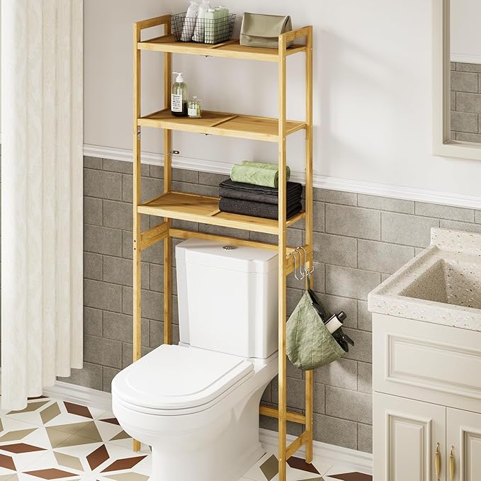 AMBIRD Over The Toilet Storage, 3-Tier Bathroom Organizer Over Toilet with Sturdy Bamboo Solid Shelves, Non-Slip Pads and 3 Hooks, Multifunctional Behind Toilet Shelf Rack, Space Saver (Original)