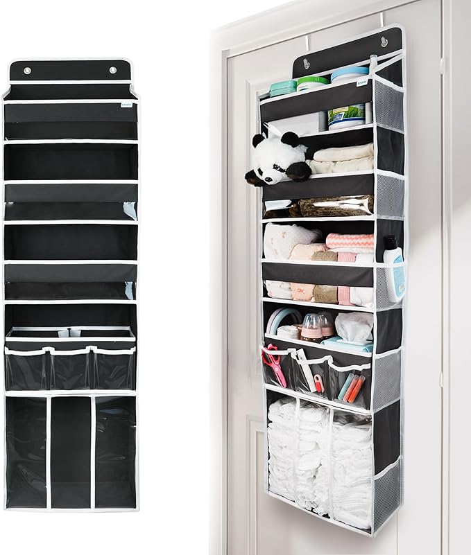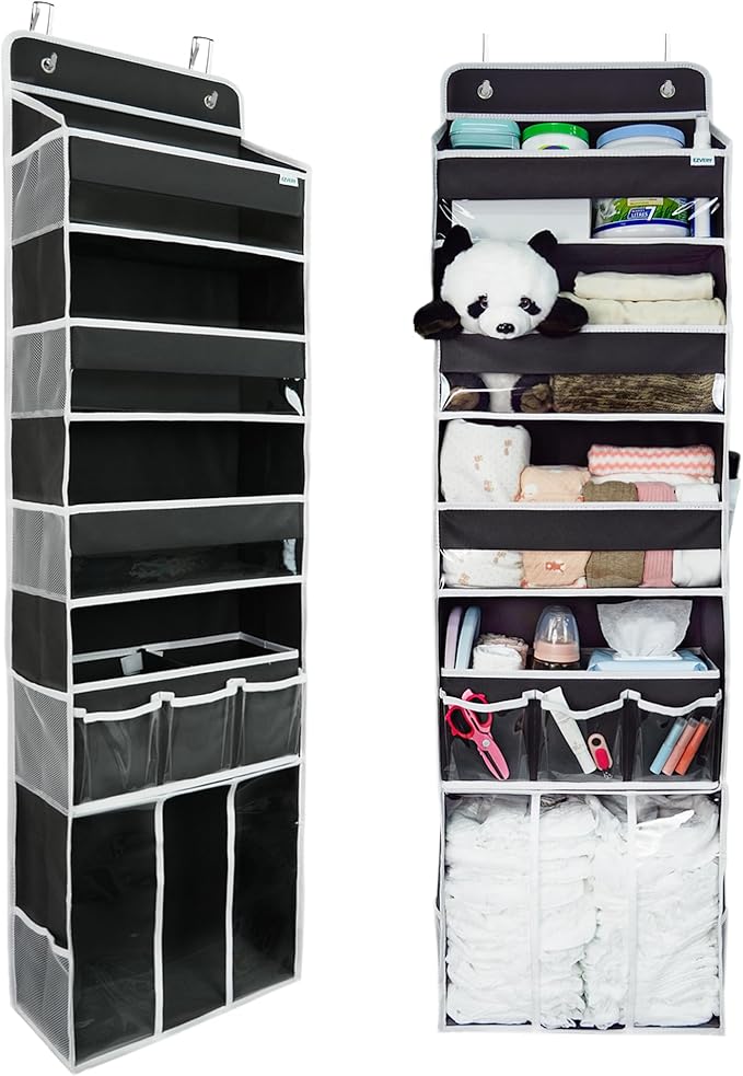 - CREATIVE PATENT DESIGN: This is not only a door hanging storage organizer, but also with an additional movable baby diaper storage caddy . The storage caddy has built-in partitions that can be divided into areas for storing daily necessities,such as bath care, clothing, diapers, baby moisturizers, wet wipes, breast pumps, and accessories. There are three PVC pockets on the outside of the nursery storage caddy for storing small items such as nail clippers, pacifiers, small toys, etc. The storage caddy can be easily removed from the hanging organizer and placed next to the bed for convenient use during late night feeding.