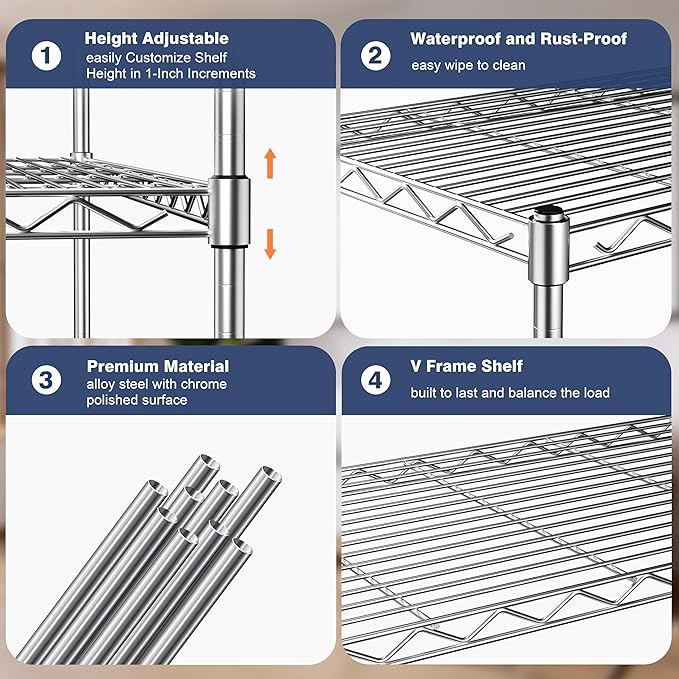 - 【Flexible & Adjustable Height】Customize your metal shelving unit to fit your needs. The design allows for easy height adjustments, making it perfect for organizing items of different sizes and optimizing your space.This wire shelves adjustable in 1-inch increments.