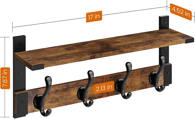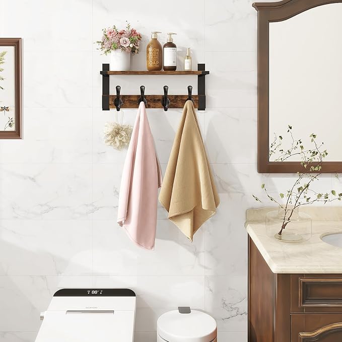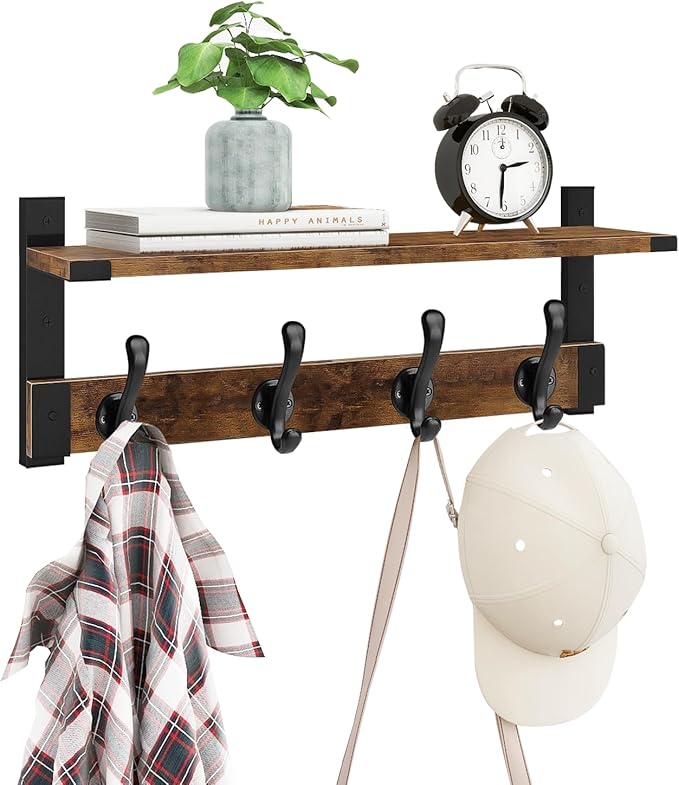 Homode Coat Rack Wall Mount with Shelf, Wood Wall Hooks with Shelf, Heavy Duty Entryway Shelf with Hooks with 4 Metal Hangers for Hanging Key Towel Hat Purse, Bathroom Bedroom, Rustic Brown Black