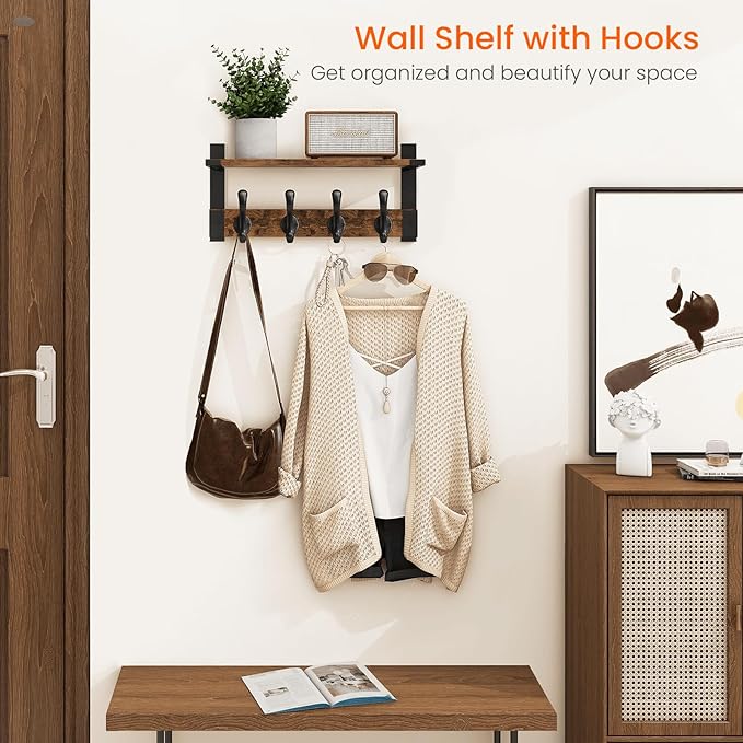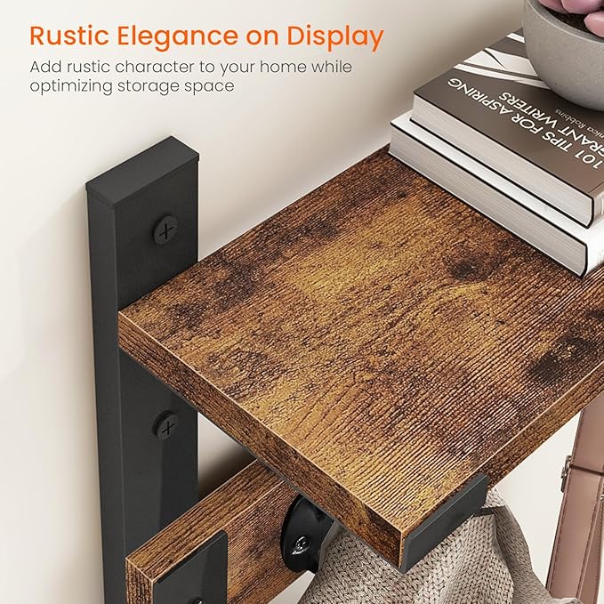 - Versatile Uses: The rustic wood shelf with hooks is seamlessly blending with various home decors, from modern to rustic while ensures all your essentials are organized and easily accessible; Ideal for any space needing a blend of storage and style