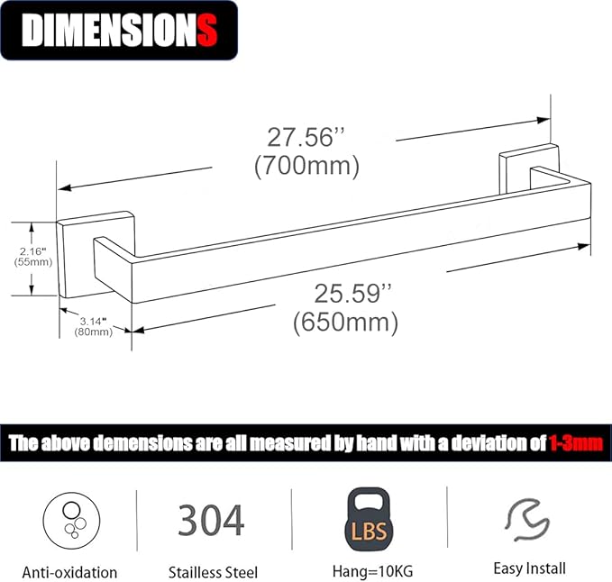 - ▶【DIMENSIONS】: Overall length is 27.56" (700mm). Projection is 3.15" (80mm). Height is 2.16" (55mm). This towel bar can be used in kitchens, baths, and laundry rooms, you can mount it to either side of your cabinet or closet door for storing at-use hand and dish towels.