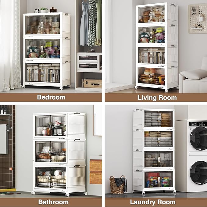 - 【Magnetic Front Open Doors & 4x Wheeled】The large storage bins with doors provide two options: front doors opening or top lid opening. The brown door can be easily seen through and with a magnetic device. The 4x 360-degree rotating wheels all have fixed functions and can be easily moved by releasing the valve, making them friendly to the elderly.