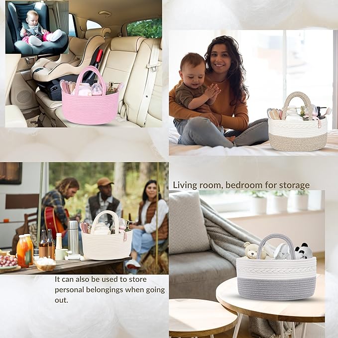 - Versatile Baby Tote Bag Keep baby essentials handy with this rope tote. A great diaper basket caddy and cotton caddy, it’s perfect for daily use or as a gift bag for baby shower girl.