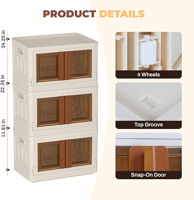FAHKNS 3 Pack 8.4 Gallon Collapsible Storage Boxes, Lidded Storage Box with Door and Wheels for Books, Towels and Clothes, Folding Storage Box for Home