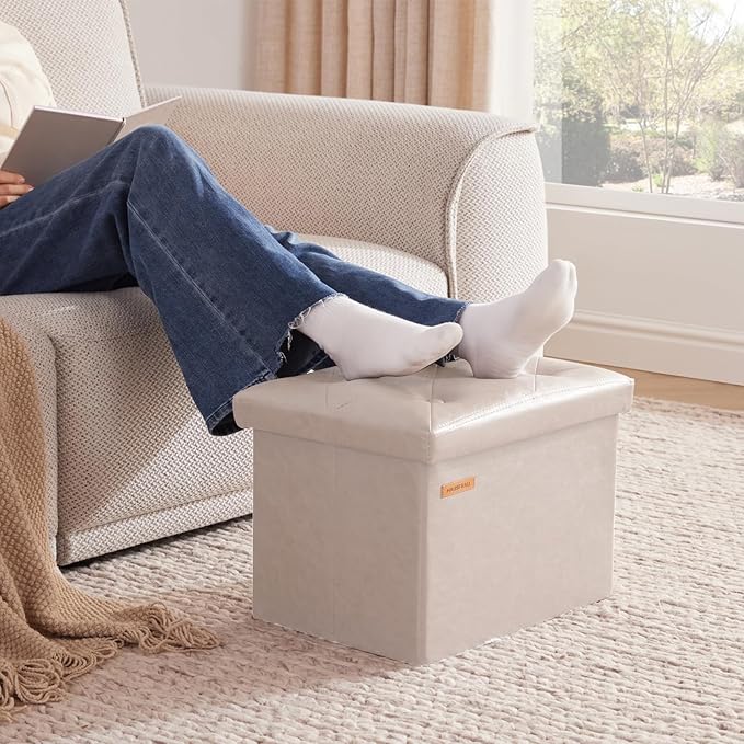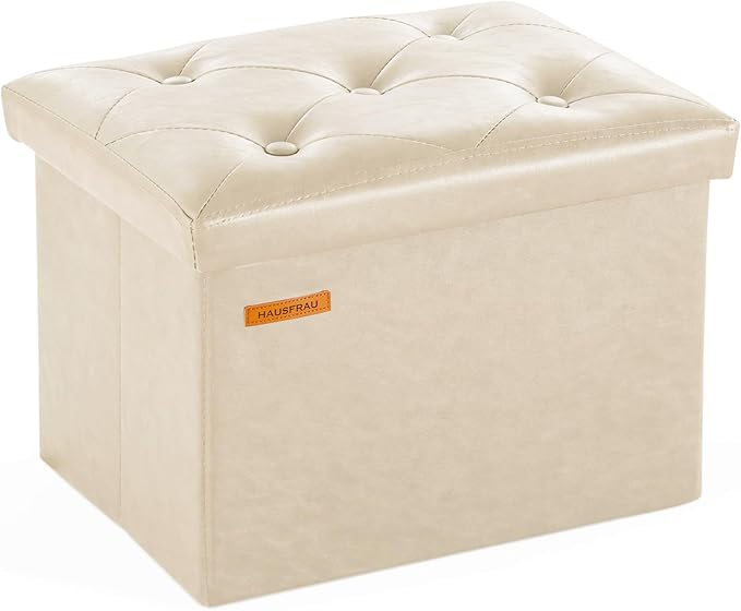 HAUSFRAU Storage Ottoman Foot Rest Stool, Small Folding Ottoman with Storage, Tufted Square Cube Footrest, Faux Leather Ivory
