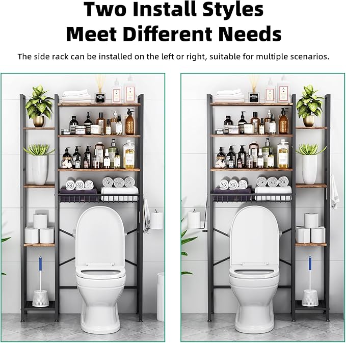 8-Tier Over The Toilet Storage with Side Rack, Over Toilet Storage Rack with Adjustable Shelf & Drain Basket, Freestanding Bathroom Organizer for Balcony, Laundry (Vintage Brown)