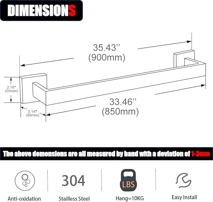 - ▶【DIMENSIONS】: Overall length is 35.43" (900mm). Projection is 3.15" (80mm). Height is 2.16" (55mm). This towel bar can be used in kitchens, baths, and laundry rooms, you can mount it to either side of your cabinet or closet door for storing at-use hand and dish towels.
