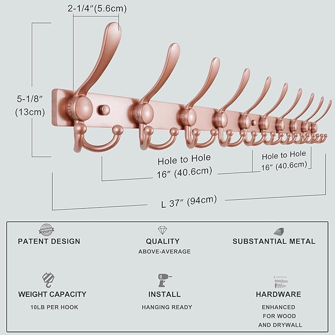 Dseap MaxStrong 2.0 Coat Rack Wall - 37” Long 10 Tri Hooks - Ultra Heavy-Duty Stainless Steel Wall Mount Coat Hanger, Hook Rail for Clothes Hats Jacket Towels Rose Gold