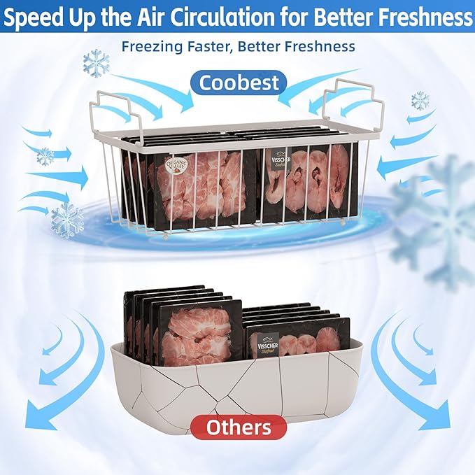 - 【Sort Frozen Food Orderly】Multiple deep freezer organizer bins can sort and organize all kinds of meat, fish, bagged vegetables and ice cream, put the new food in the bottom and the old food or opened bags up top to get used first, avoid food lost in the bottom of freezer.