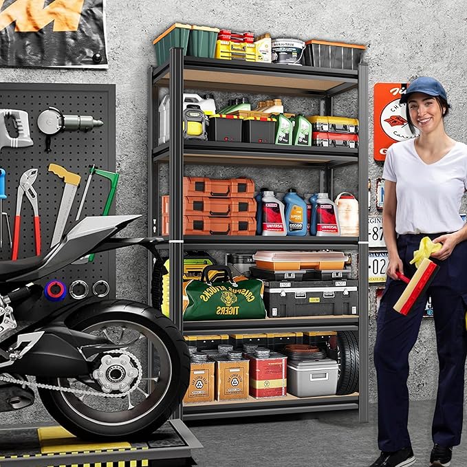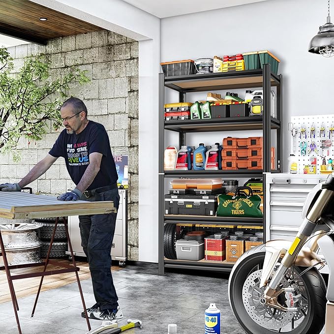 5 Tier Garage Shelving Wood Storage Shelves 2000 lb Load Capacity Adjustabl Shelving Units 57.4" H*29.5" W*11.8" D Metal Shelf Suitable for Basement Warehouse Pantry,Black
